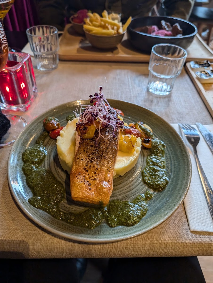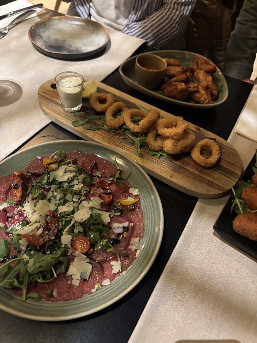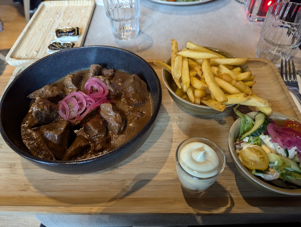 One of the standout dishes at Bistro Fuego is the Steak Black Angus, a tender and flavorful cut of meat that's sure to satisfy even the most discerning steak lovers. Another popular option is the Mechelner Rindereintopf, a traditional Belgian beef stew that offers rich, comforting flavors, ideal for colder days. If you're in the mood for seafood, the Im Ofen Gegarter Lachs, or oven-baked salmon, is a delightful choice, cooked to perfection and bursting with freshness. For a lighter, yet equally delicious starter, the Carpaccio offers thinly sliced beef served with a drizzle of olive oil, adding a burst of flavors with every bite.